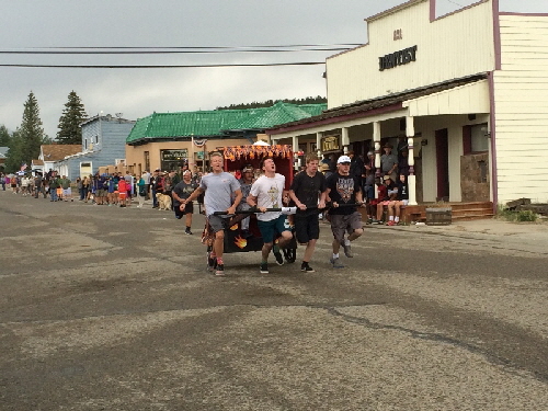 After the burros with their 'miners' take off on their marathon race, the infamous Fairplay Outhouse Race follows. The RMRH entry did not win the coveted "Golden Toilet Seat", but we did get voted the "People's Choice Award" for our "Pearly Gates" entry.